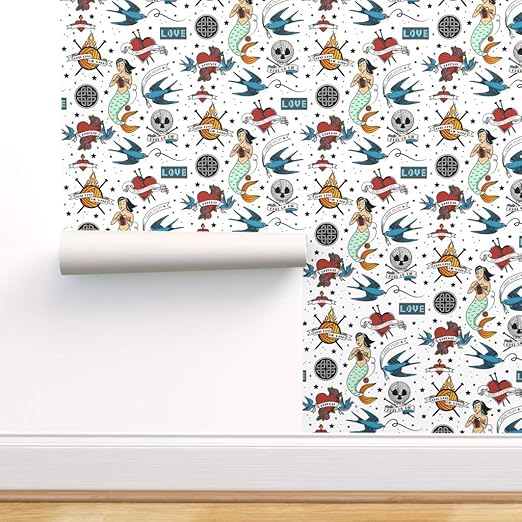 Spoonflower Non Pasted Wallpaper Knitting Retro Tattoo Mermaid
