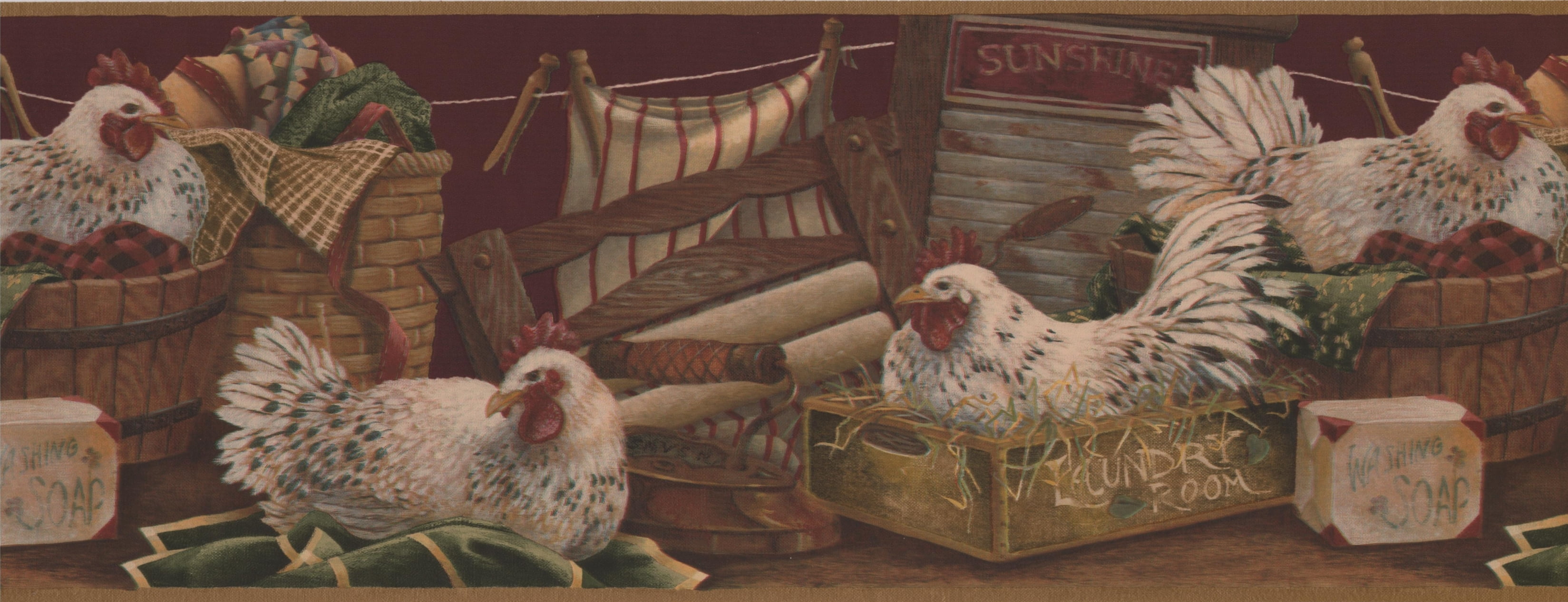 Wallpaper Border White Hens In Laundry Room Drying Line Garnet