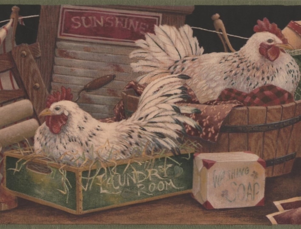 White Hens In Laundry Room Drying Line Pine Green Wallpaper Border