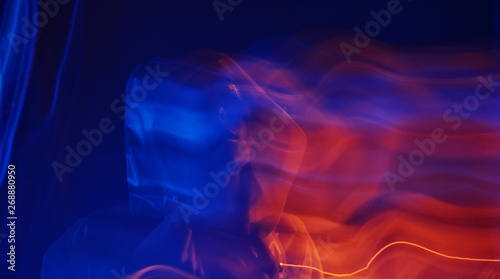Sensual Woman In Hood With Blue Red Neon Lights In Background