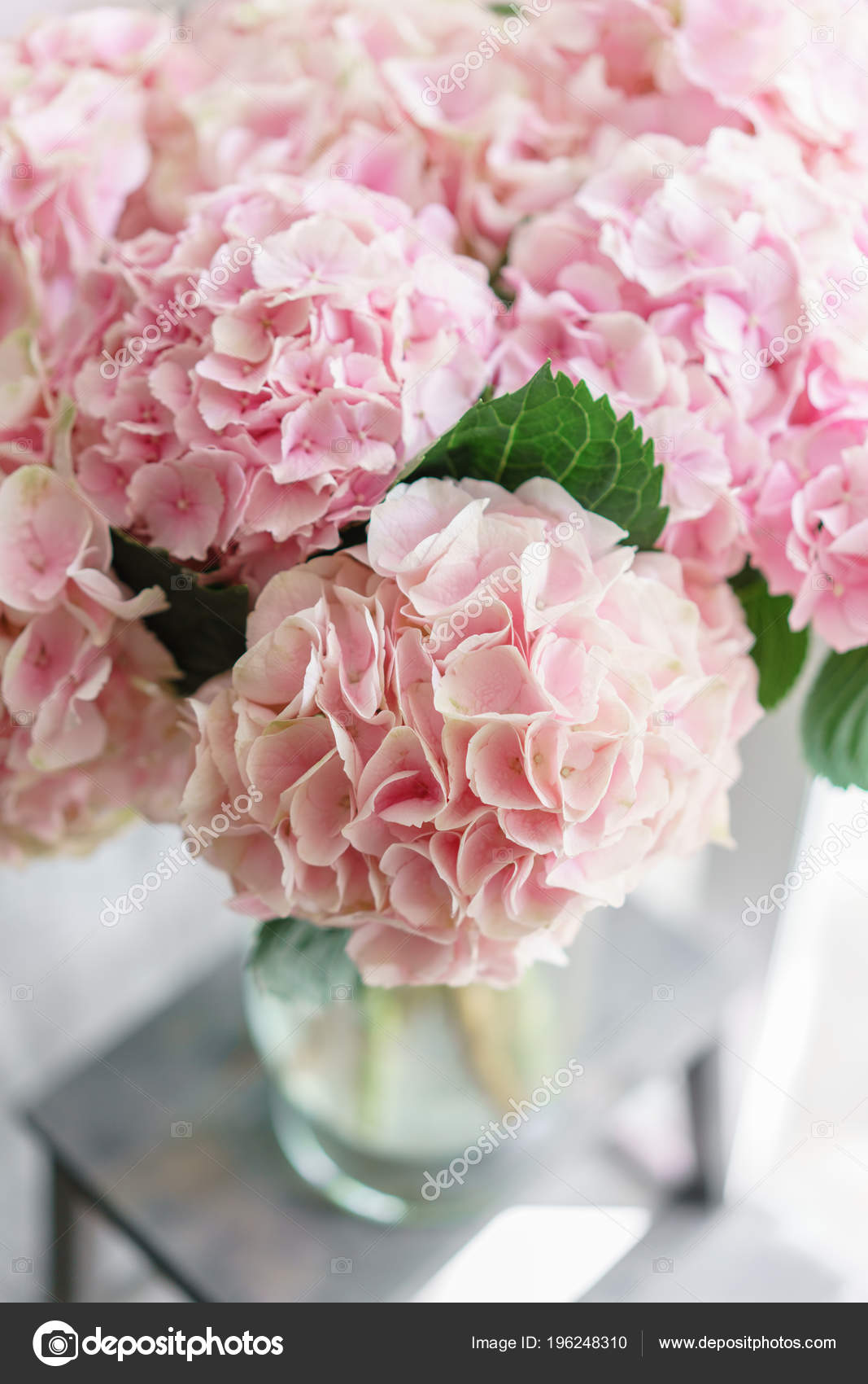 Beautiful Pink Hydrangea Flowers In A Vase On A Table Bouquet Of