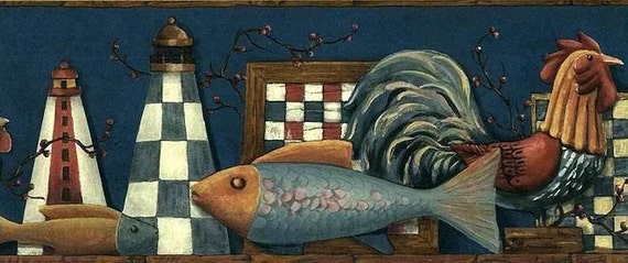 Americana Lighthouse Navy Wallpaper Border Rooster Vintage Etsy