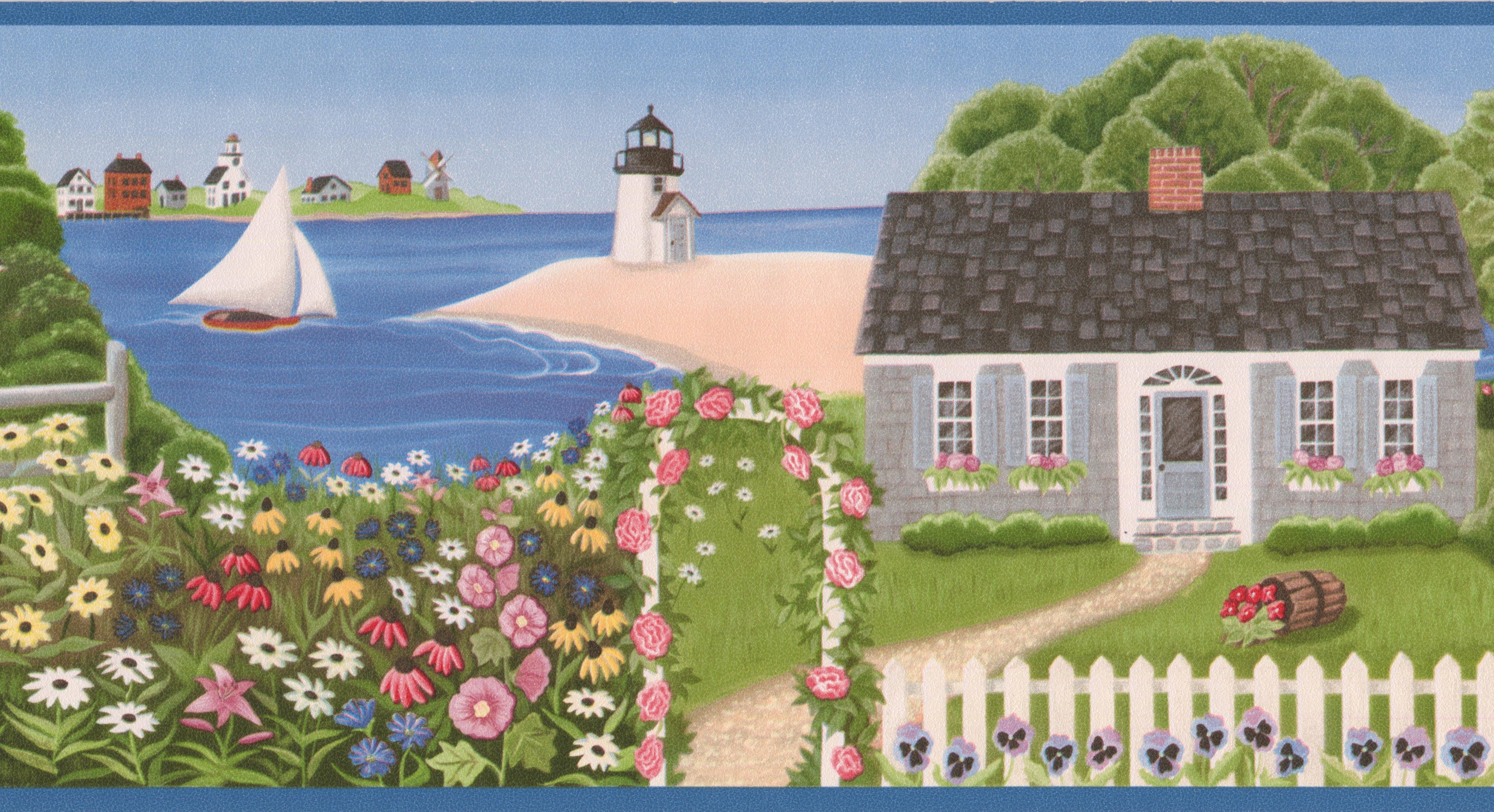 Wallpaper Border Village By The Sea Flowers Cottages Sailboats