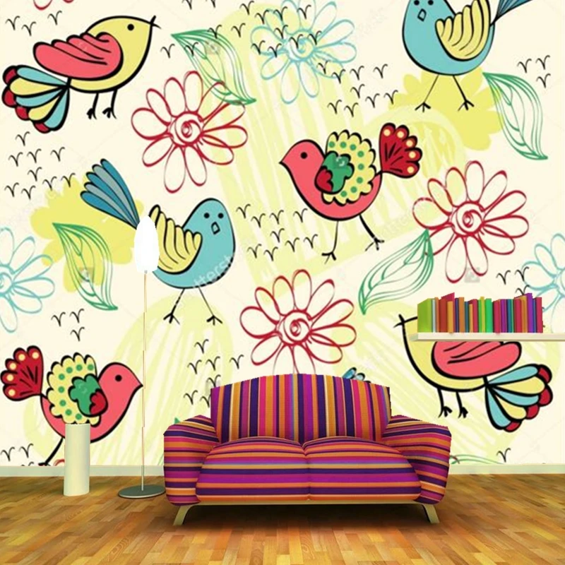 Lovely Cartoon Mural Various Colors Flowers And Birds Wallpaper