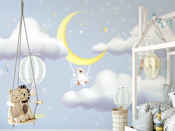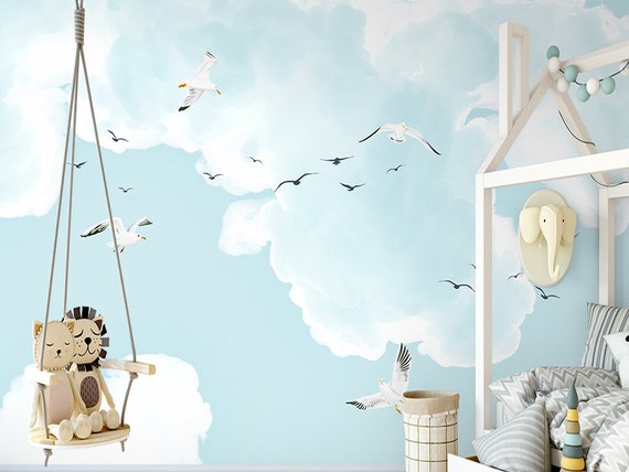 Lovely Cartoon Clouds Kids Nursery Wallpaper Wall Mural Hand Etsy