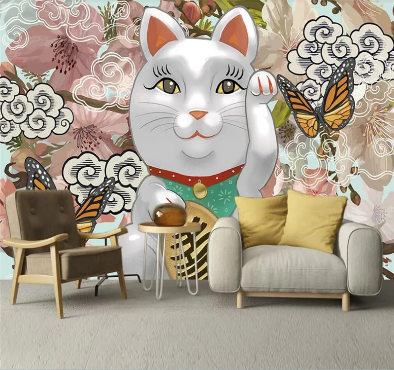 Custom 3d Wallpaper Peach Hand Painted Lucky Cat Feng Shui