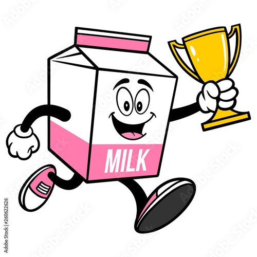 Strawberry Milk Carton Mascot Running With A Trophy A Cartoon