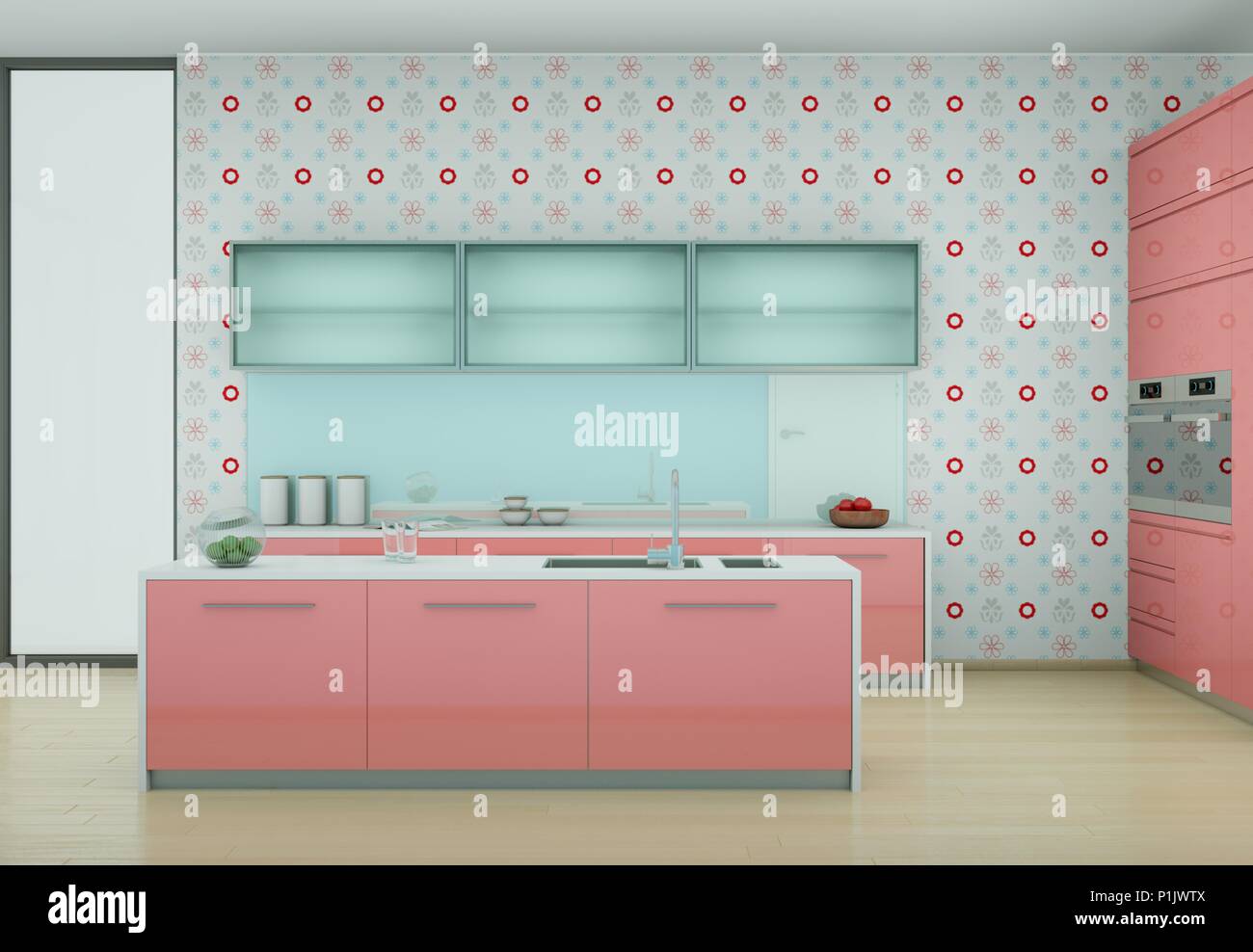 Pink Modern Kitchen With Vintage Wallpaper Stock Photo Alamy