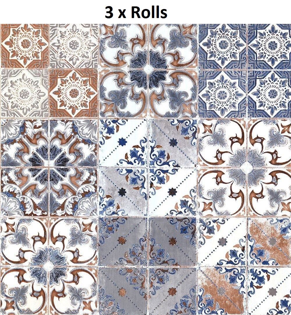 3 X Orange Blue Valencia Tile Wallpaper Moroccan Mediterranean