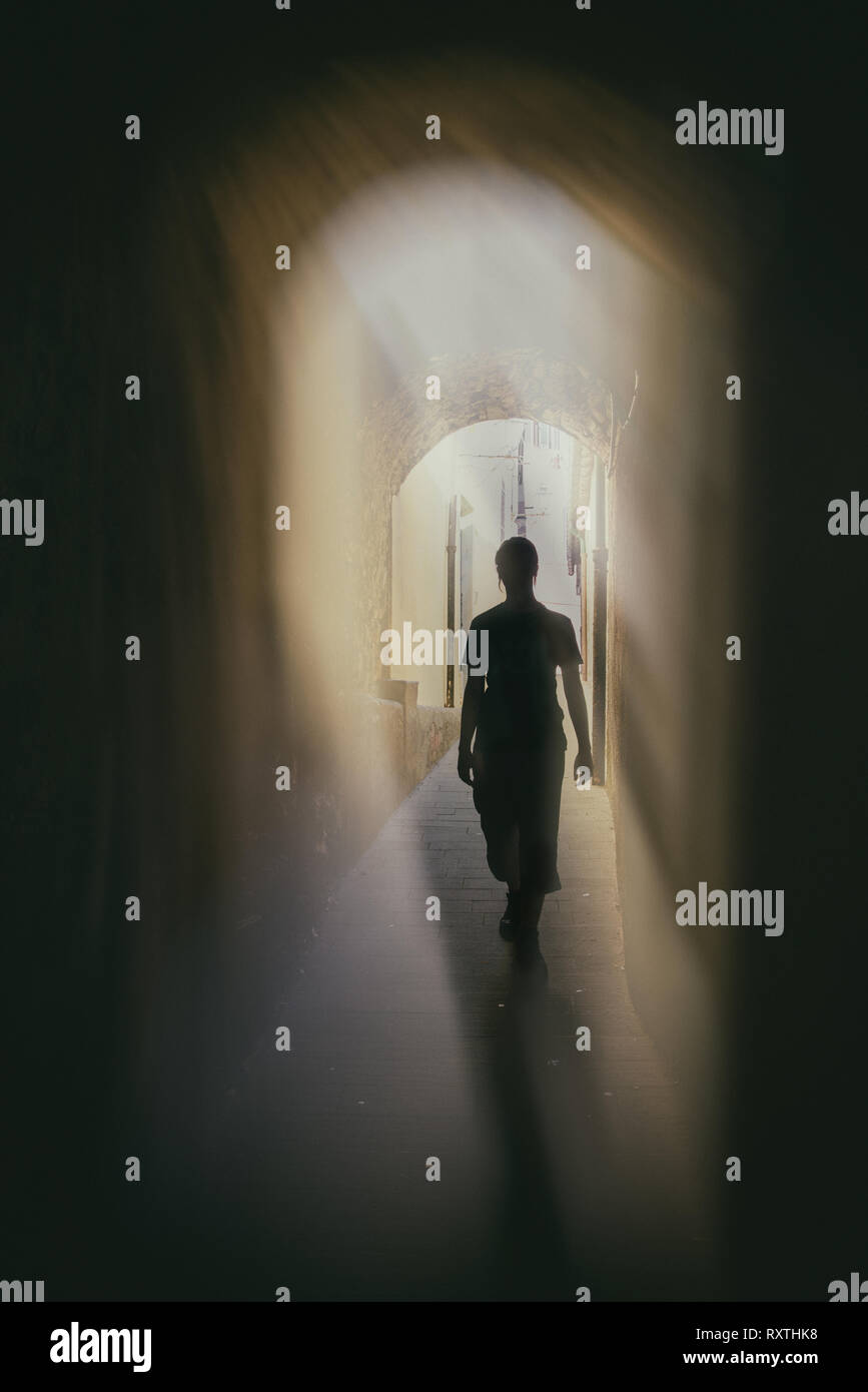 The Silhouette Of A Person In The Narrow Passage With Backlight