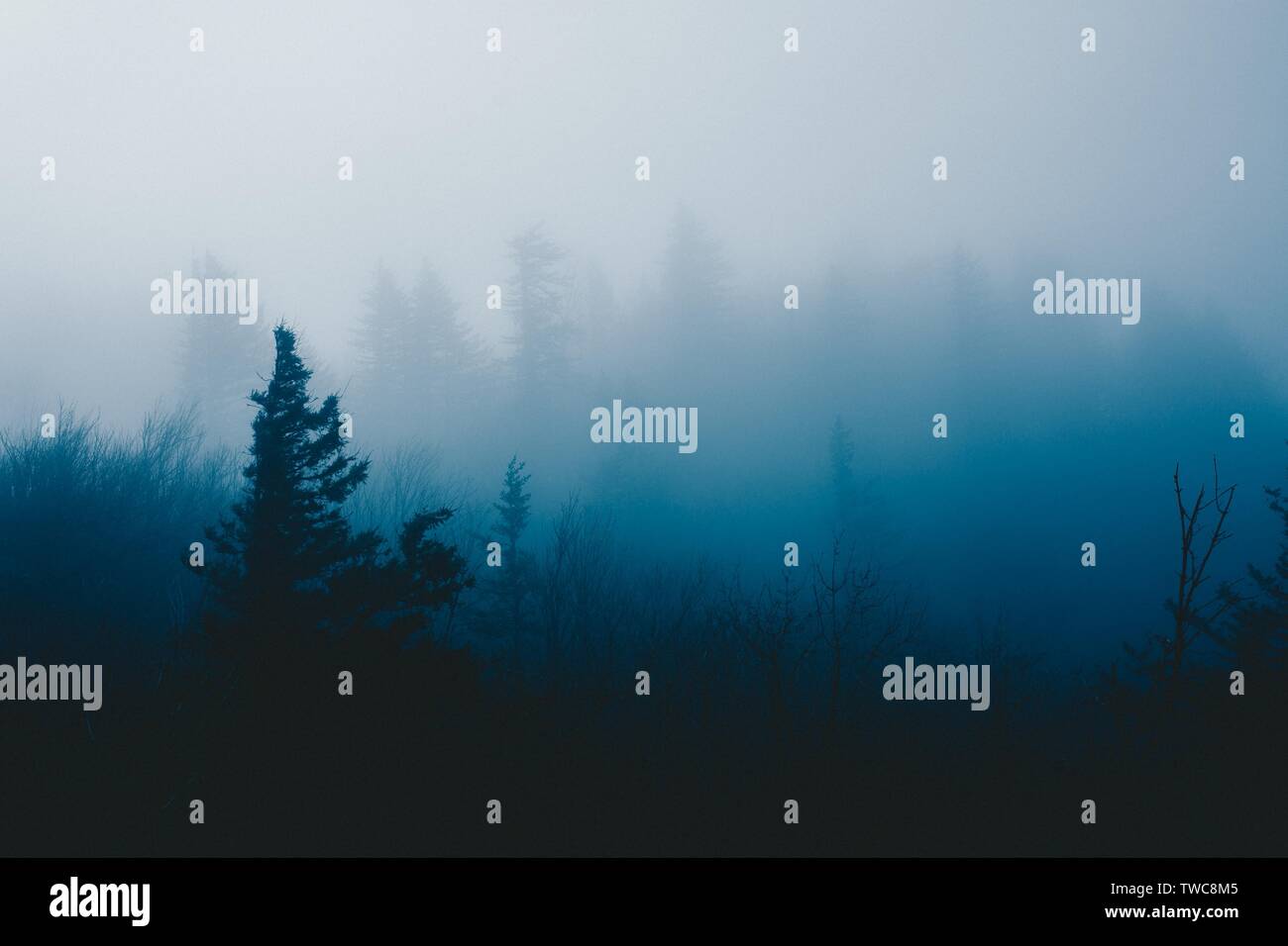 A Beautiful Shot Of A Mysterious Dark Foggy Forest With Tall Pine
