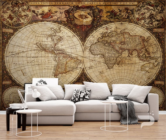 World Map Wall Mural Old Map Wallpaper Vintage Marine Map Of Etsy
