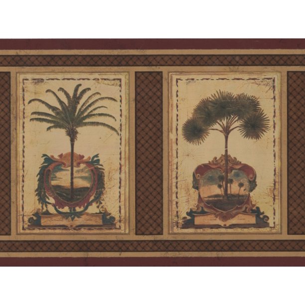 Wallpaper Border Vintage Squares Palm Trees Dark Brown Wall