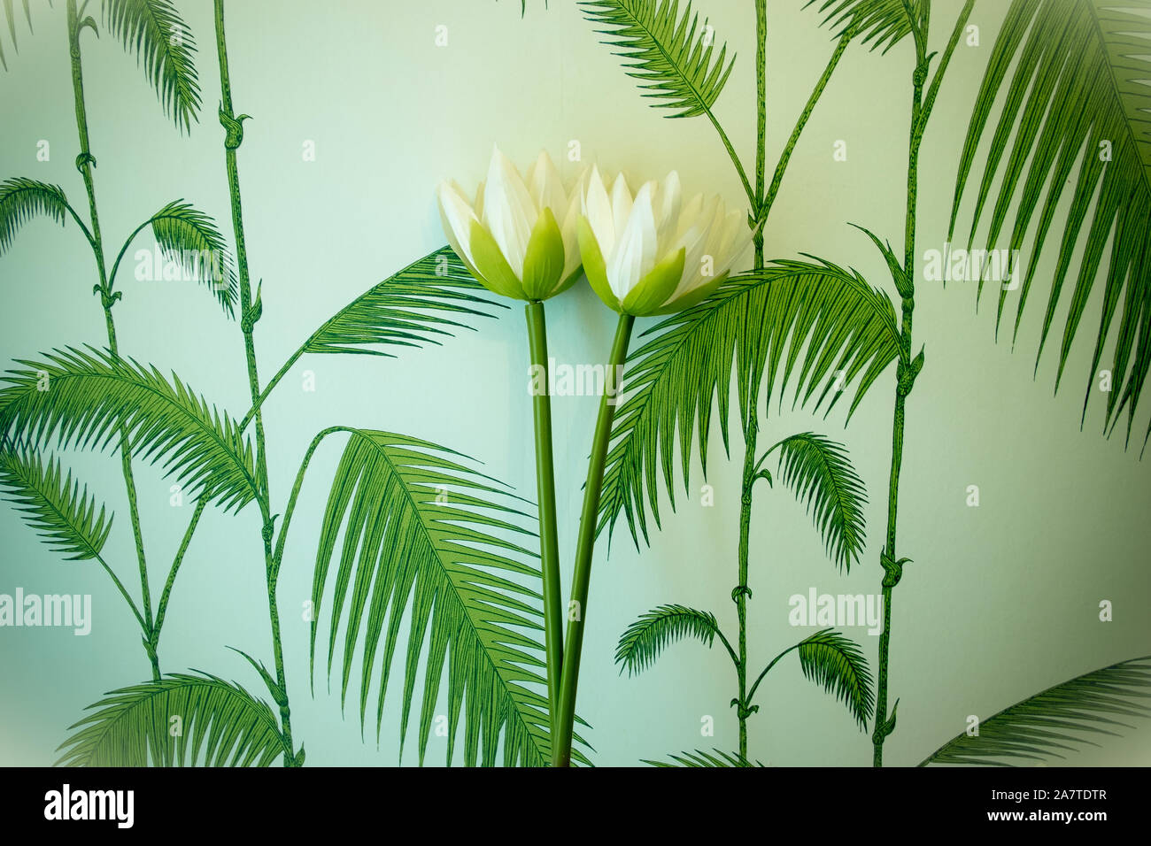 Tropical Palm Leaf Wallpaper With White Flowers Feeling Of