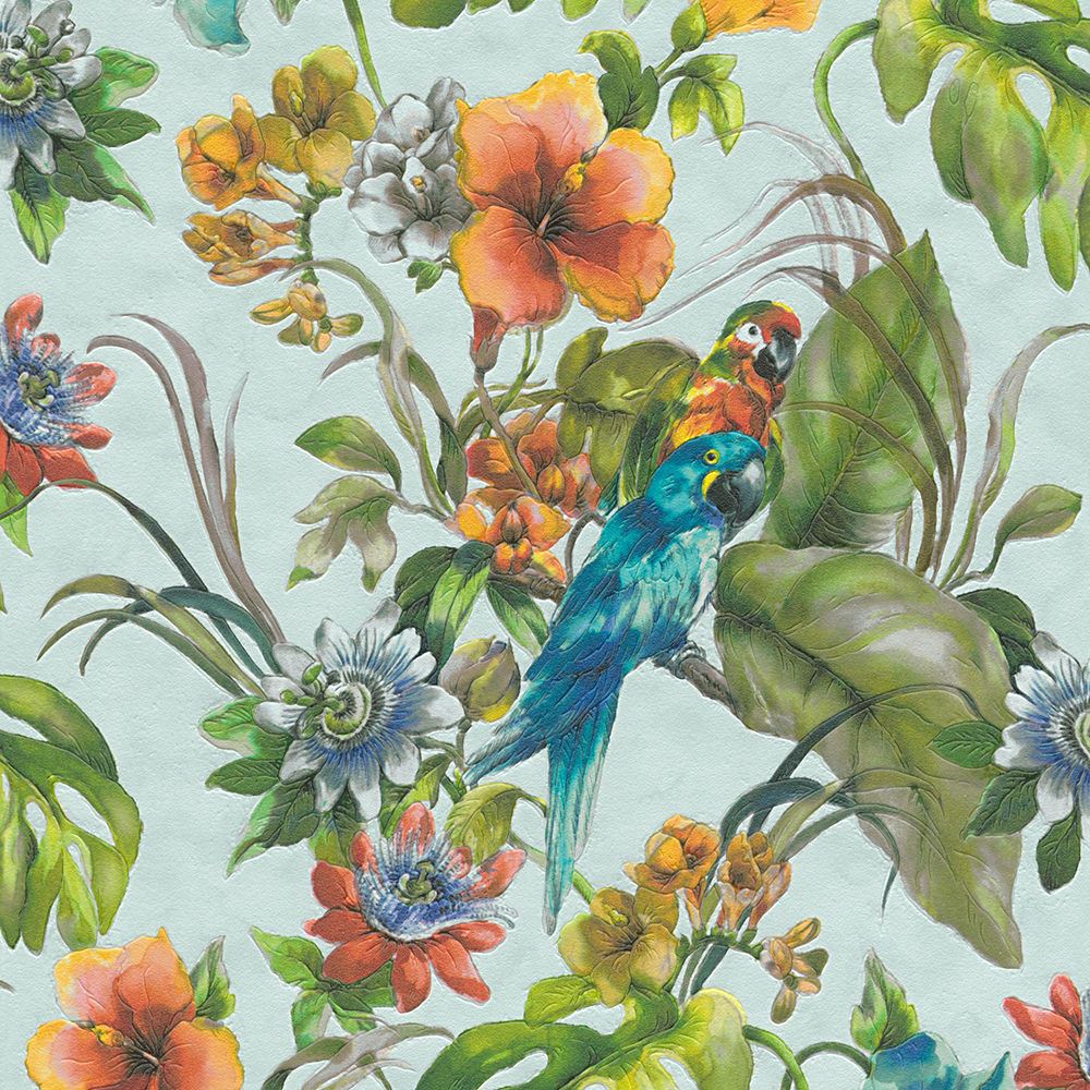 Tropical Parrots Wallpaper Birds Floral Green Blue Orange