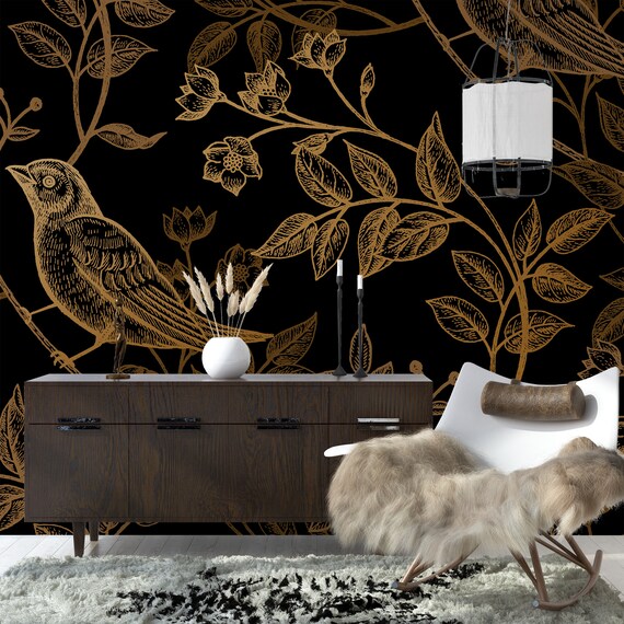 Black Yellow Birds Wall Mural Dark Peel And Stick Wallpaper Etsy