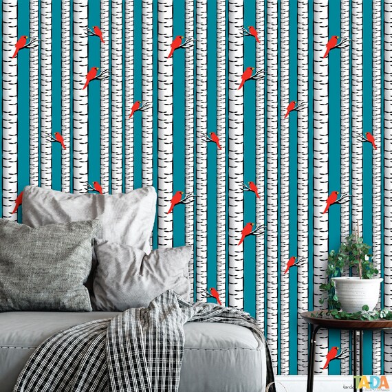 Cardinals And Birch Trees Peel And Stick Wallpaper Forest Etsy