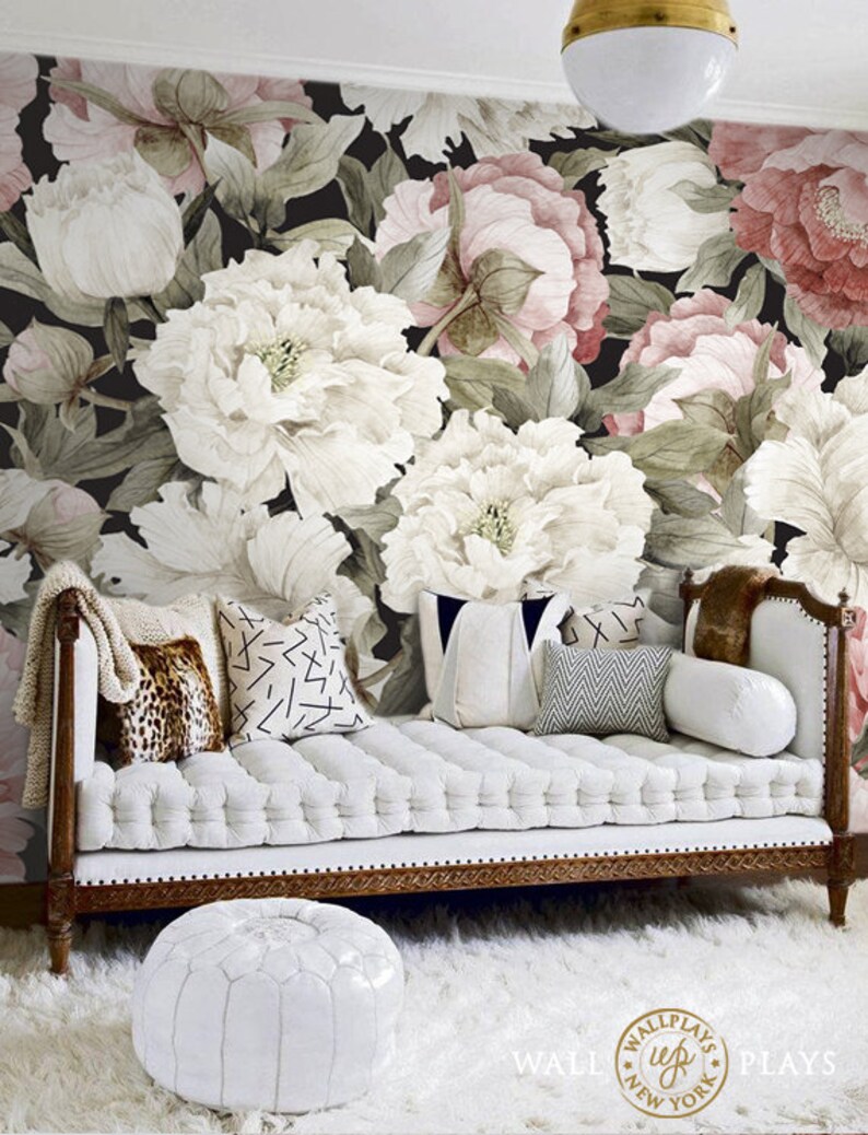 Peonies Flowers Mural Black Removable Wallpaper Pinknbluebaby