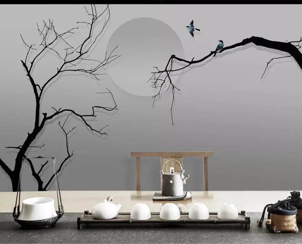 Zen Hand Painted Ink Abstract Tree Tv Background Wall Decoration Painting Professional Custom Mural Photo Wallpaper