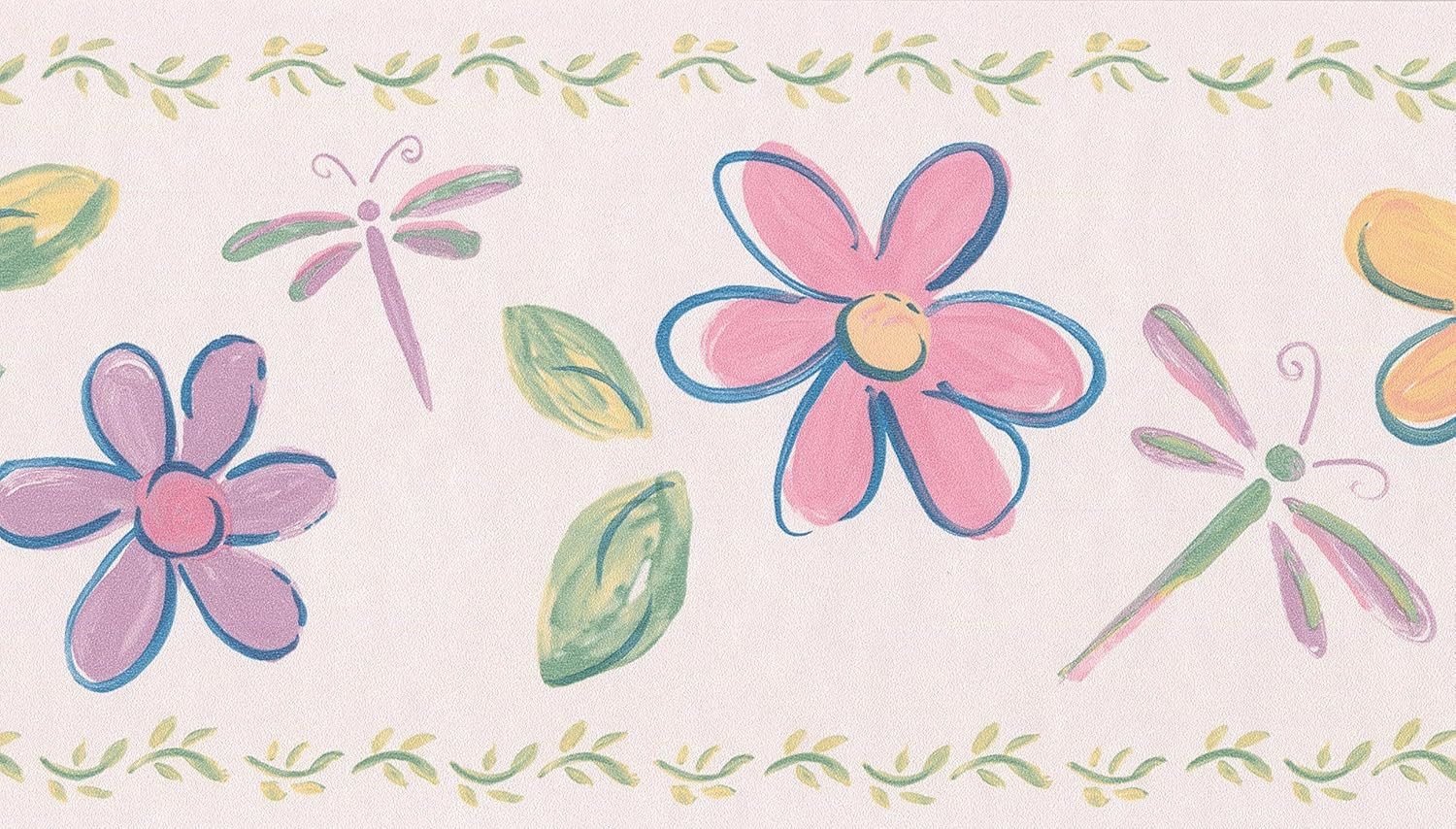 Yellow Red Purple Flowers Dragonfly Lady Bugs Blush Pink Wallpaper