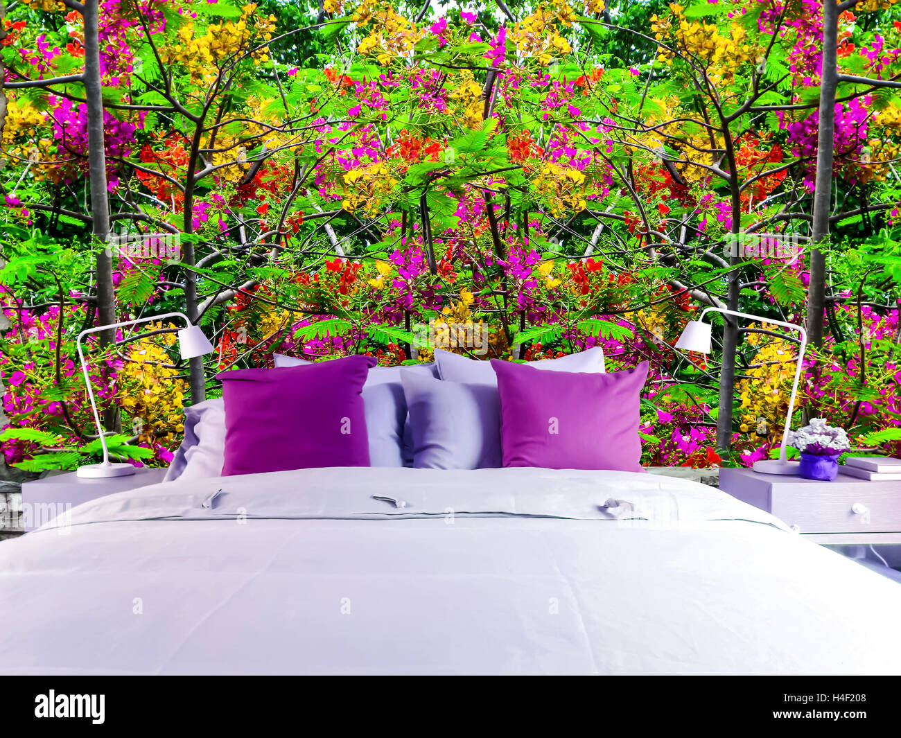 Bedroom Garden View Of Rainbow Flower Wallpaper Purple Pillows