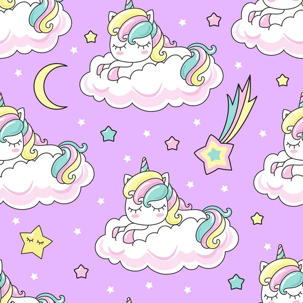 Seamless Pattern With Rainbow Unicorns Clouds Stars Confetti On Lilac Background For Design Fabric Wallpaper Paper Etc Vector Stock Vector Image Art Alamy