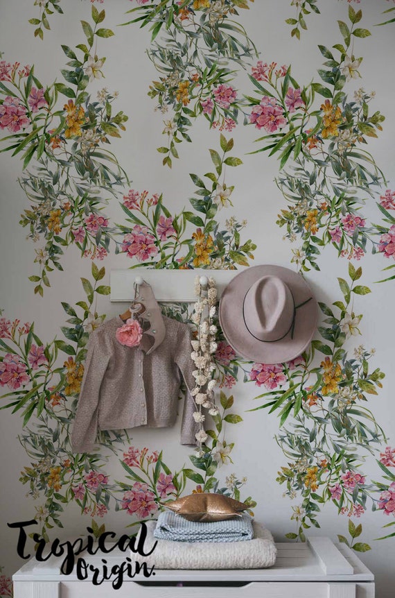 Meadow Flowers Removable Wallpaper Green Pink Garden Blooms Etsy