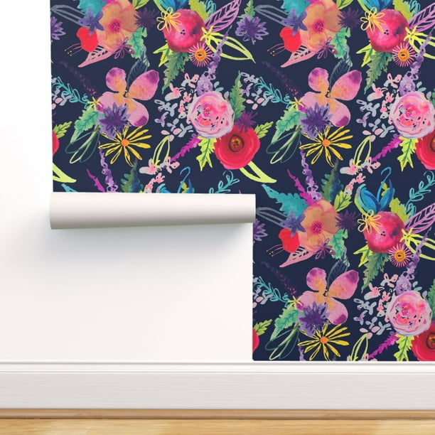 Peel And Stick Removable Wallpaper Floral On Navy Watercolor