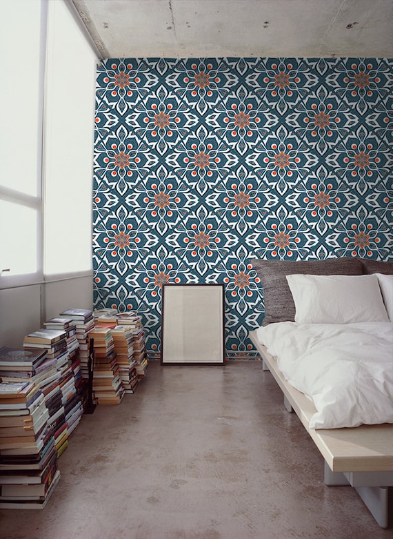 Mandala Pattern Removable Wallpaper Orange And Blue Wall Mural Etsy