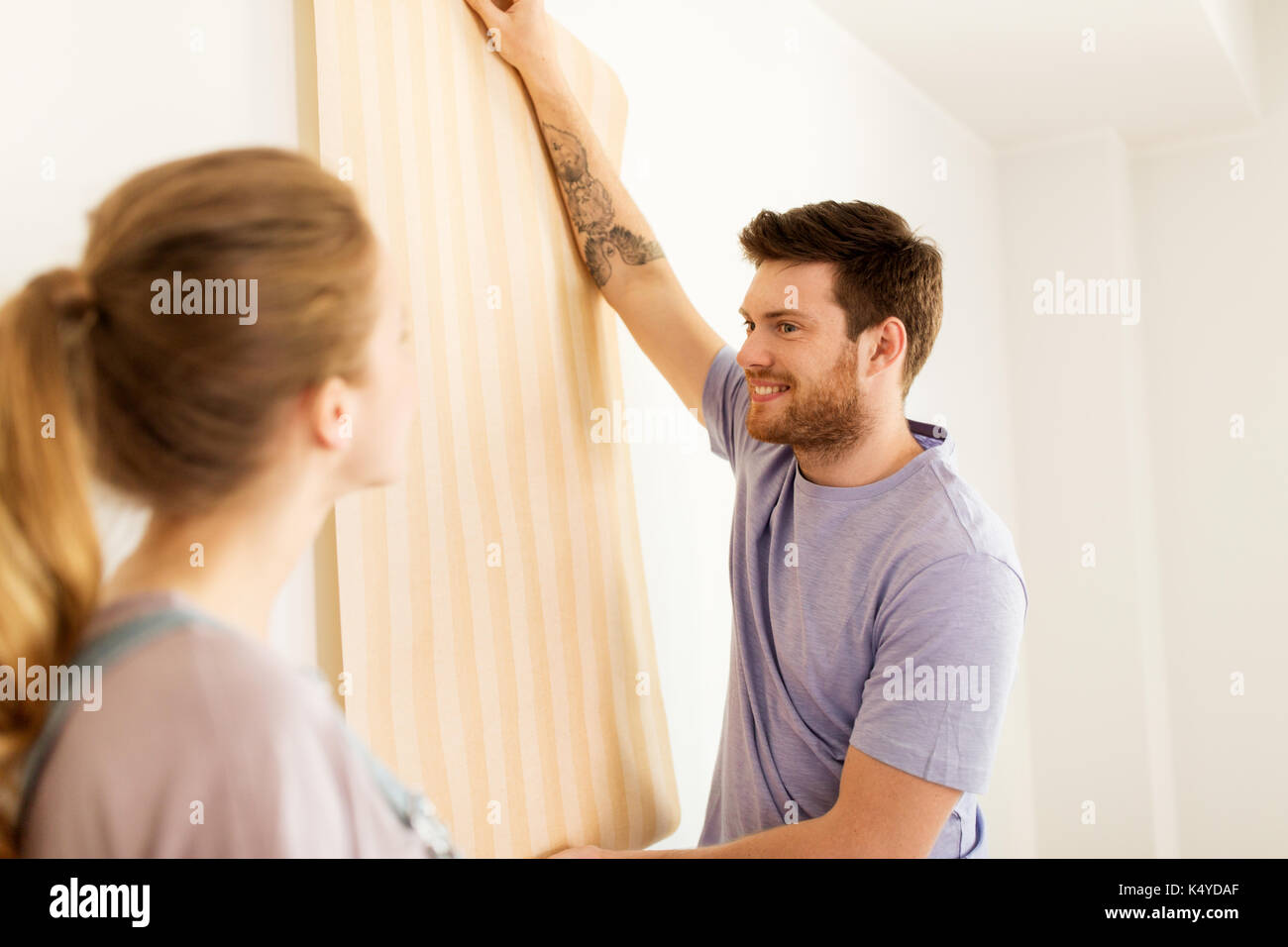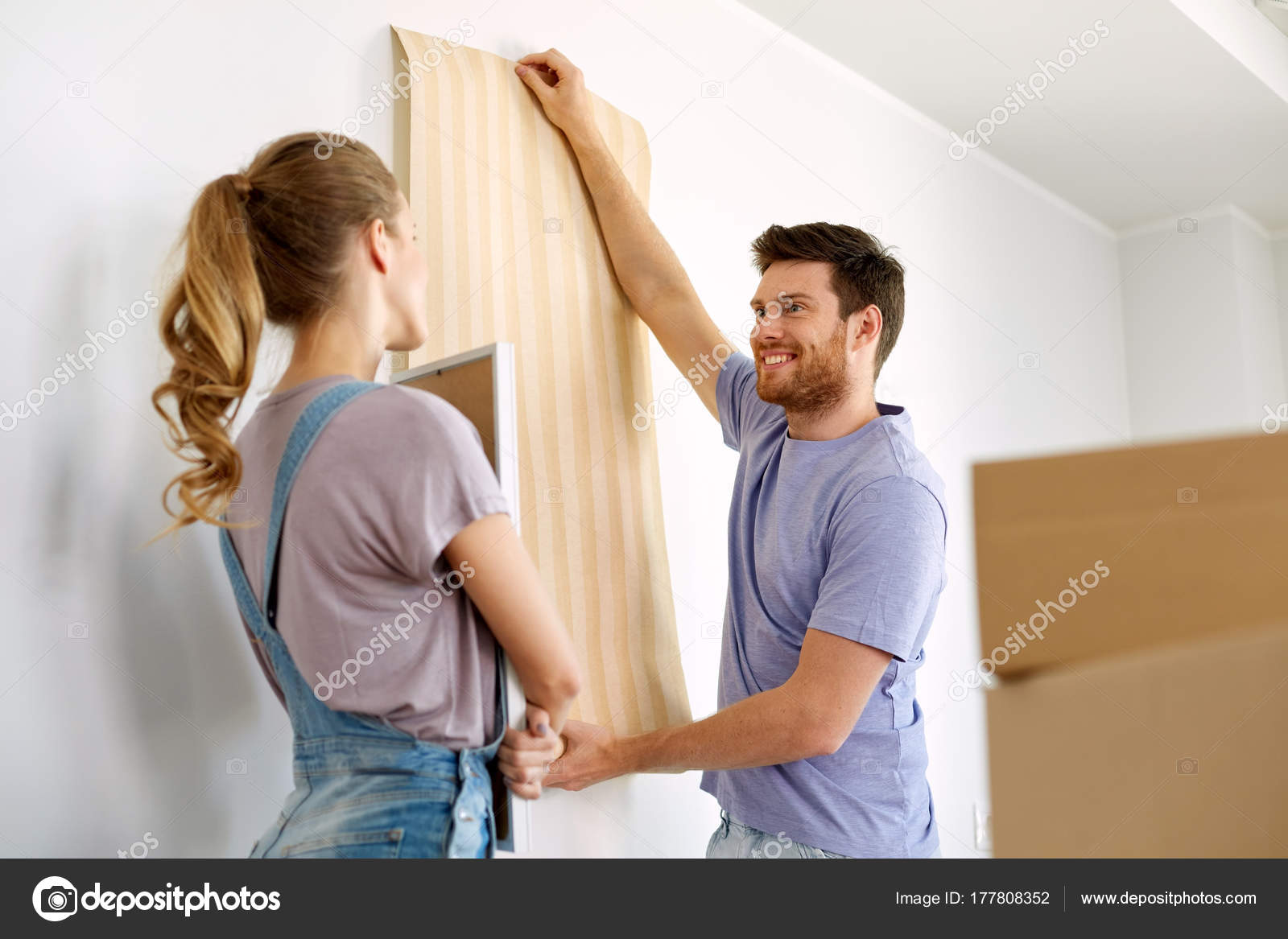 Happy Couple With Wallpaper Repairing New Home Stock Photo Alamy
