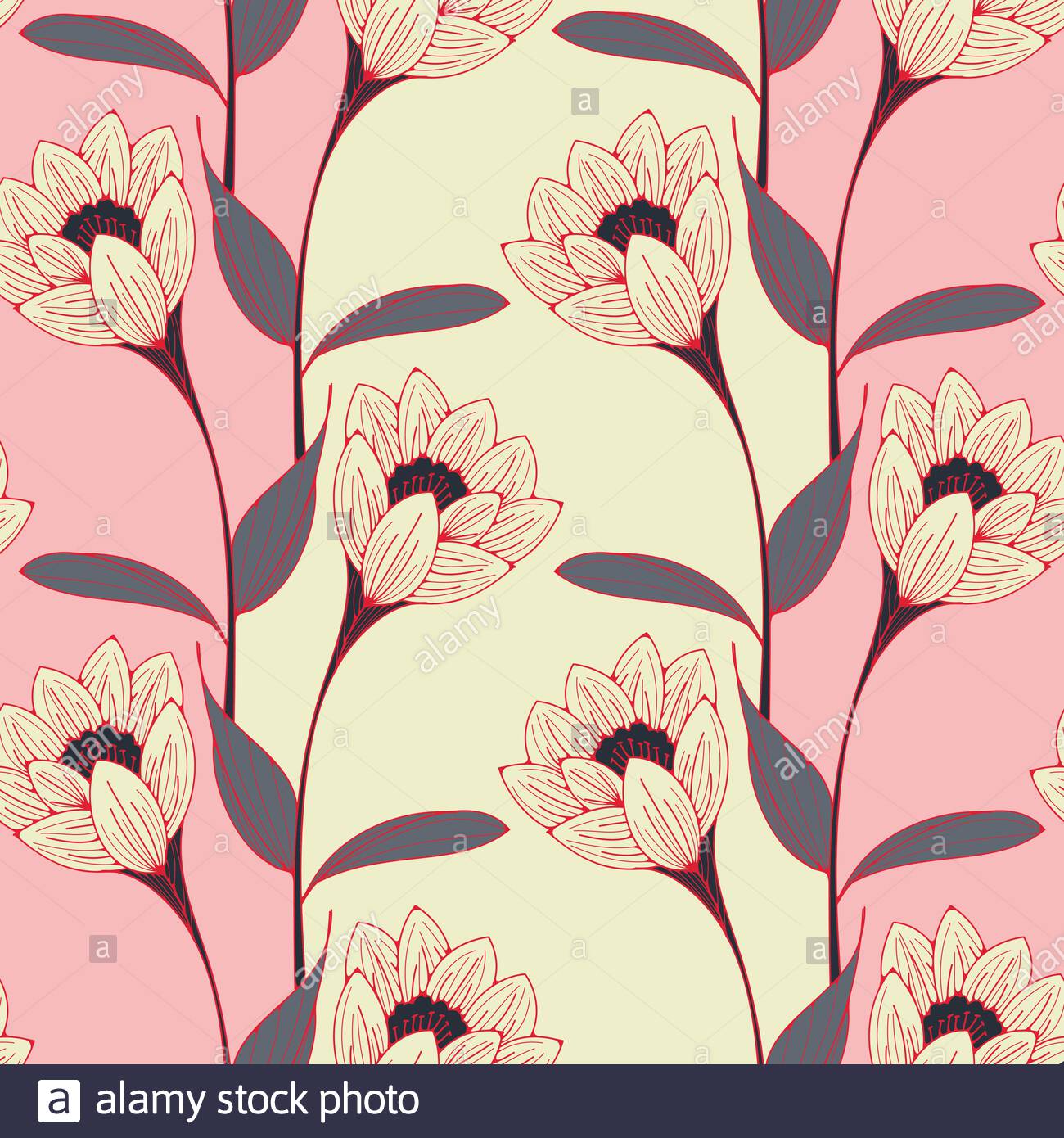 Retro Floral Crocus Wallpaper Tile In Ivory Pink Shades Stock