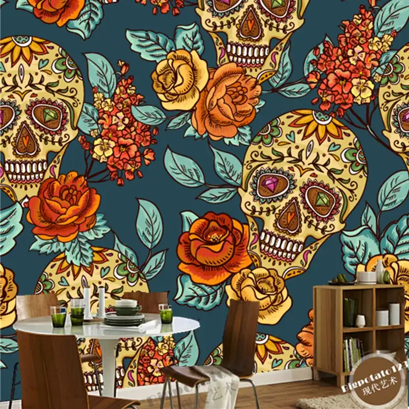 Custom 3d Retro Wallpaper Skull Flowers Used To Decorate The
