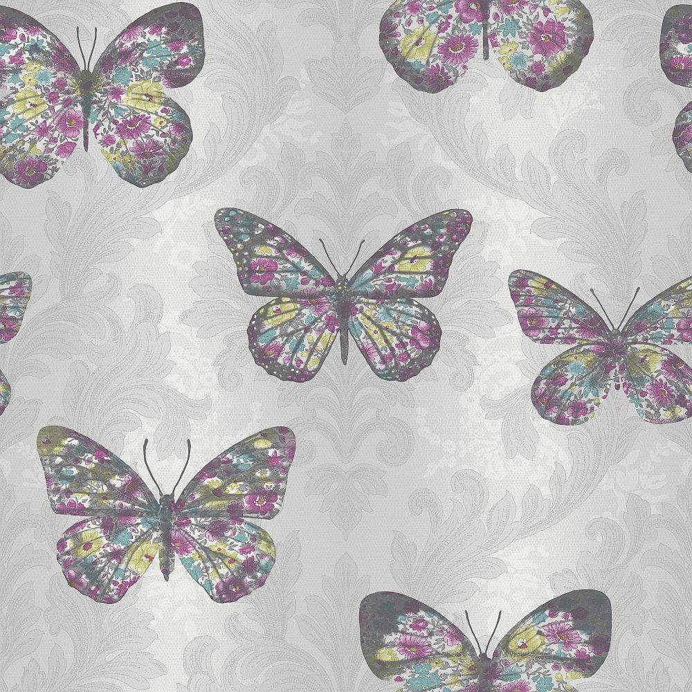 Arthouse Midsummer Dove Grey Damask Wallpaper Floral Butterfly