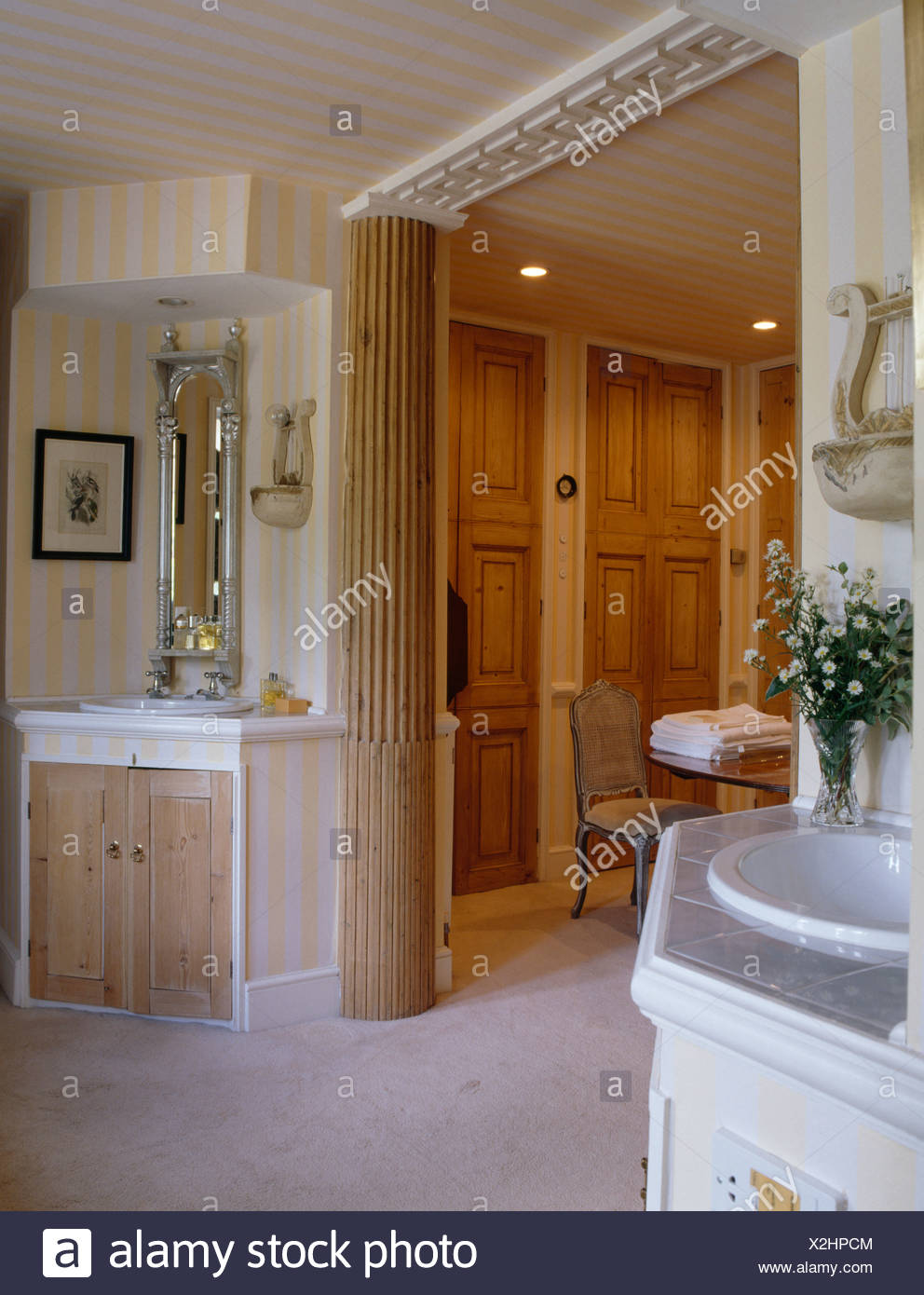 Bedroom With Striped Yellow Wallpaper Grey And Yellow Colour