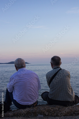 Two Men Friends Sitting And Synchronized On Cliff Watching Sunset