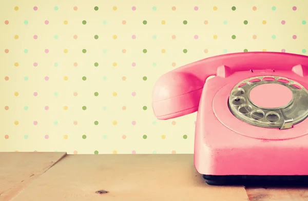 Vintage Phone On A Wooden Table With Wallpaper In The Background Stock Photo Alamy
