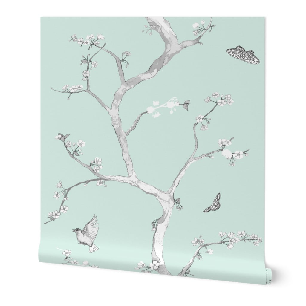 Wallpaper Roll Chinoiserie Floral Mint Tree Bird Flower Asian 24in