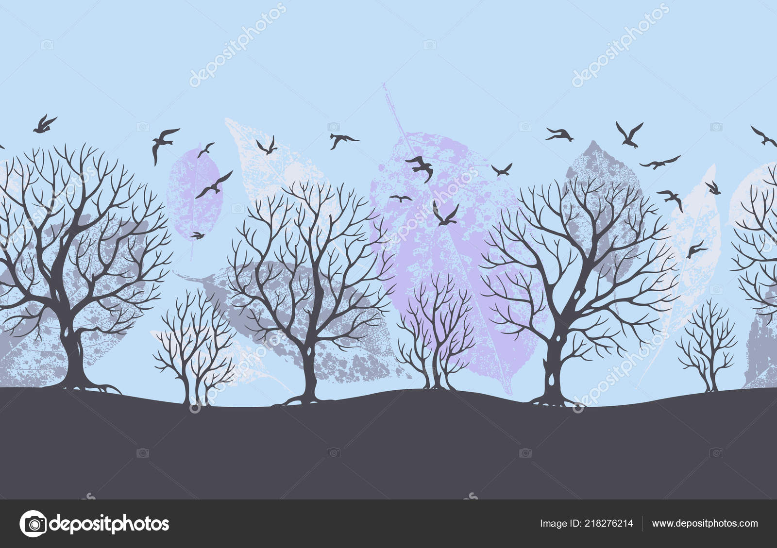 Seamless Border Trees Birds Cold Colors Vector Illustration