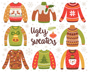 Christmas Background With Cute Ugly Christmas Sweaters Set Sweater Party Collection For Invitations