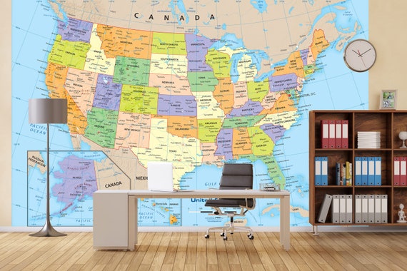 Us Map Mural Usa Political Map Wallpaper Peel Stick Etsy