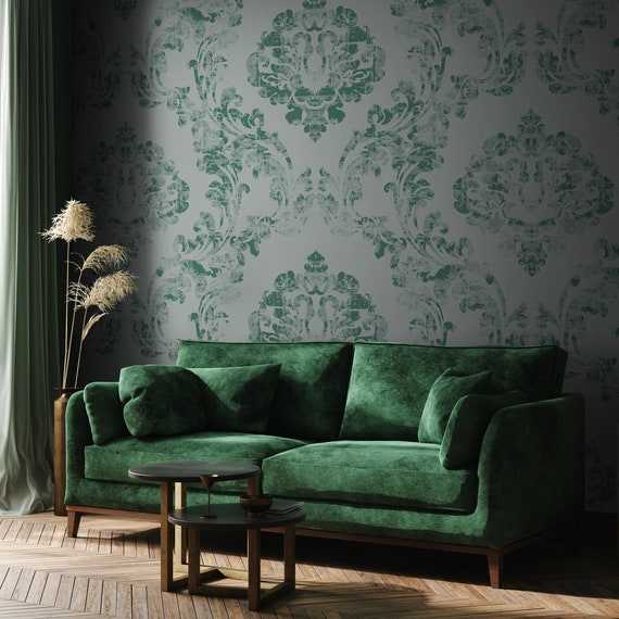 Green Vintage Damask Mural Dark Victorian Wallpaper Retro Etsy
