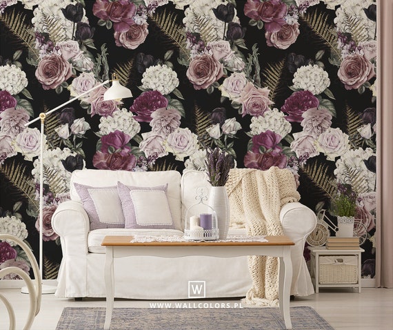 Vintage Roses Wallpaper On Dark Background Botanical Wall Etsy
