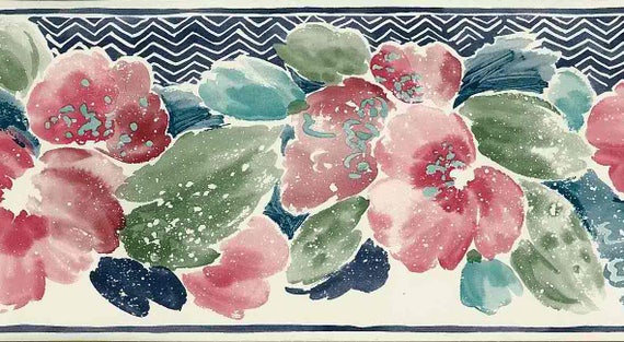Chevron Floral Vintage Wallpaper Border Navy Pink Green Etsy