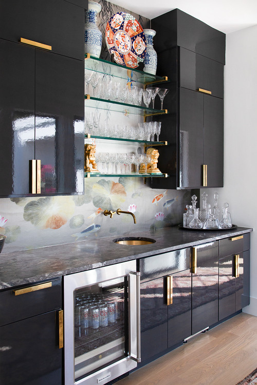 Home Bar With Koi Wallpaper Backsplash And Black High Gloss