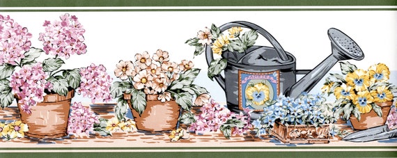 Flower Garden Wallpaper Border Country Flower Pot Watering Etsy