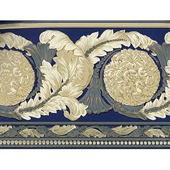 Wallpaper Border Architectural Acanthus Leaf Medallion Scroll Blue