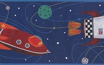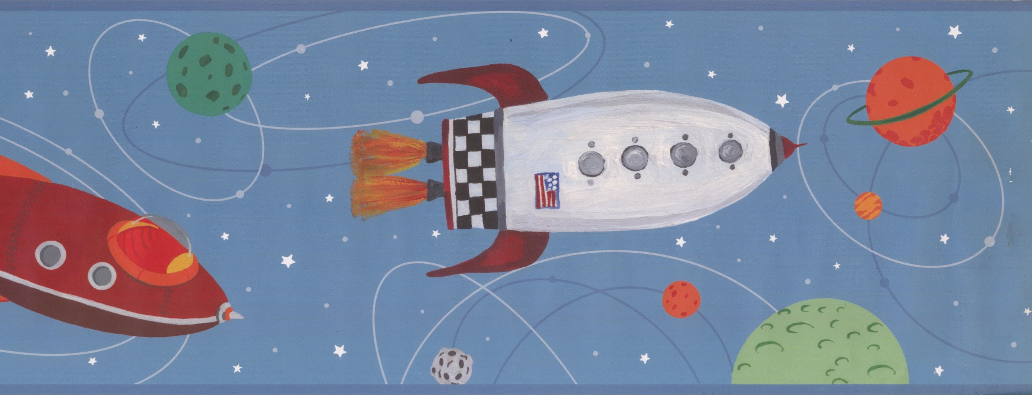 Rocket Spaceship Planets Stars Blue Wallpaper Border Kids Design