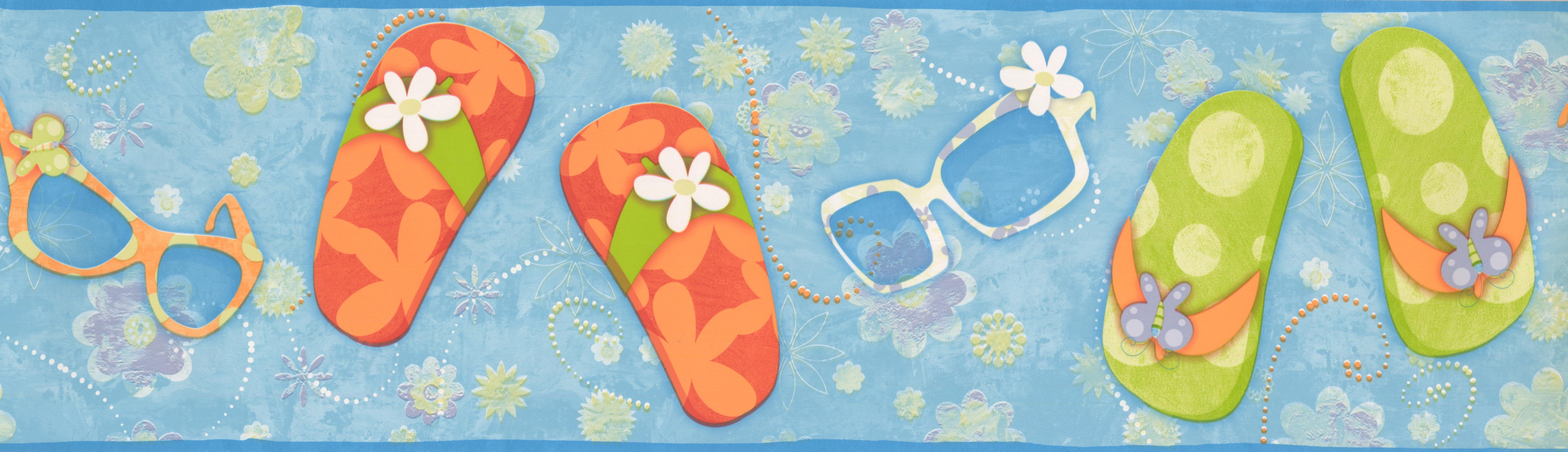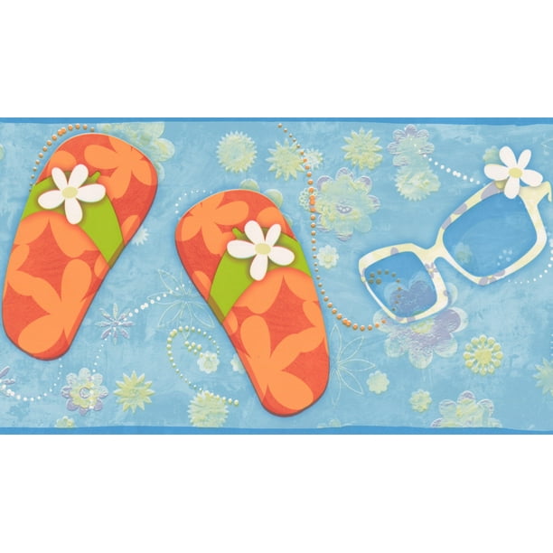 Wallpaper Border Beach Flip Flops Sunglasses Flowers Blue Wall