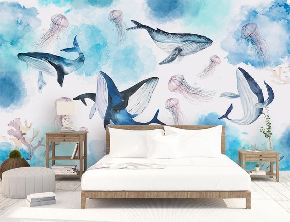 Watercolor Whale Jellyfish Wallpaper Entryway Wall Decor Etsy