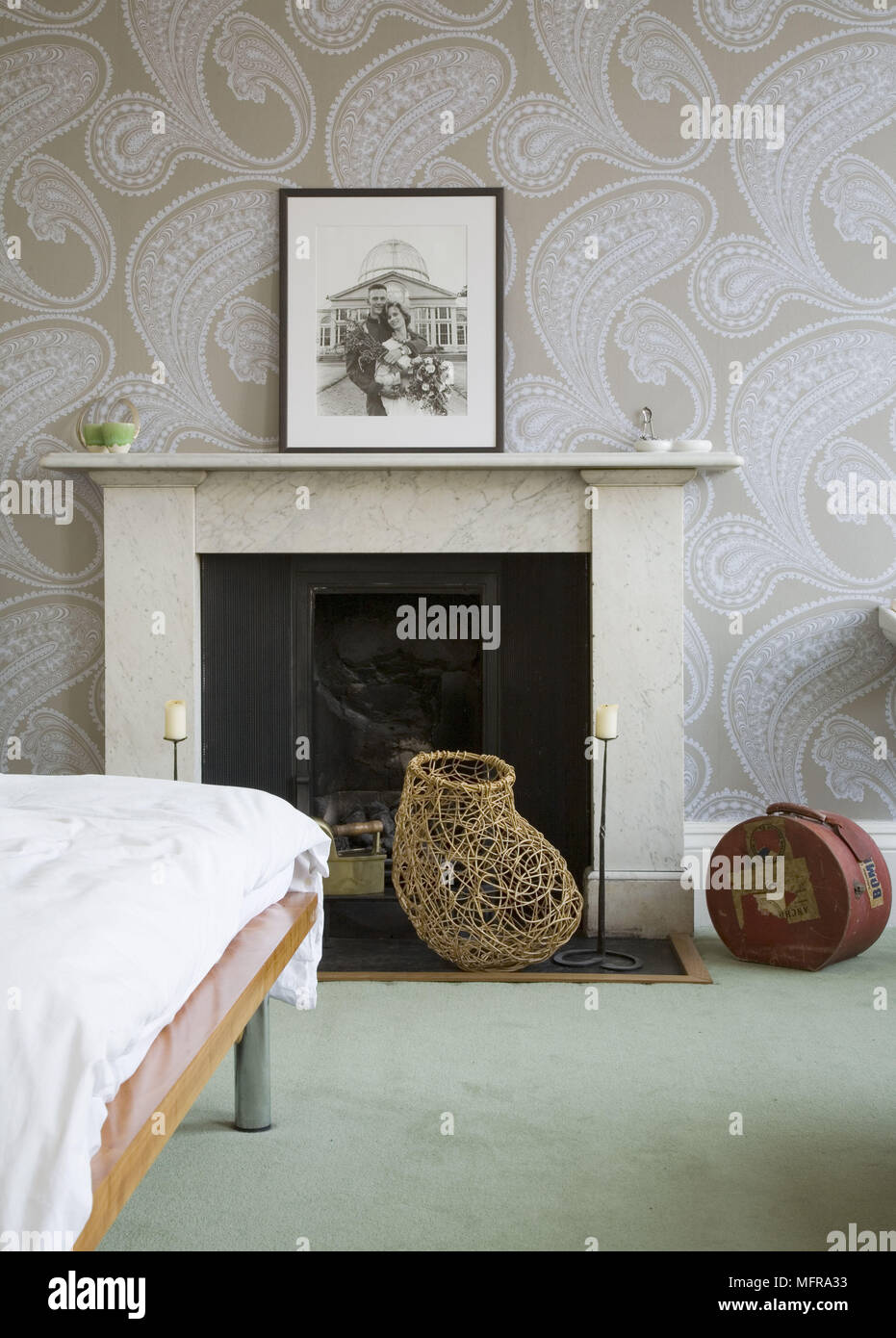 Period Style Fireplace In Bedroom With Oversize Paisley Pattern
